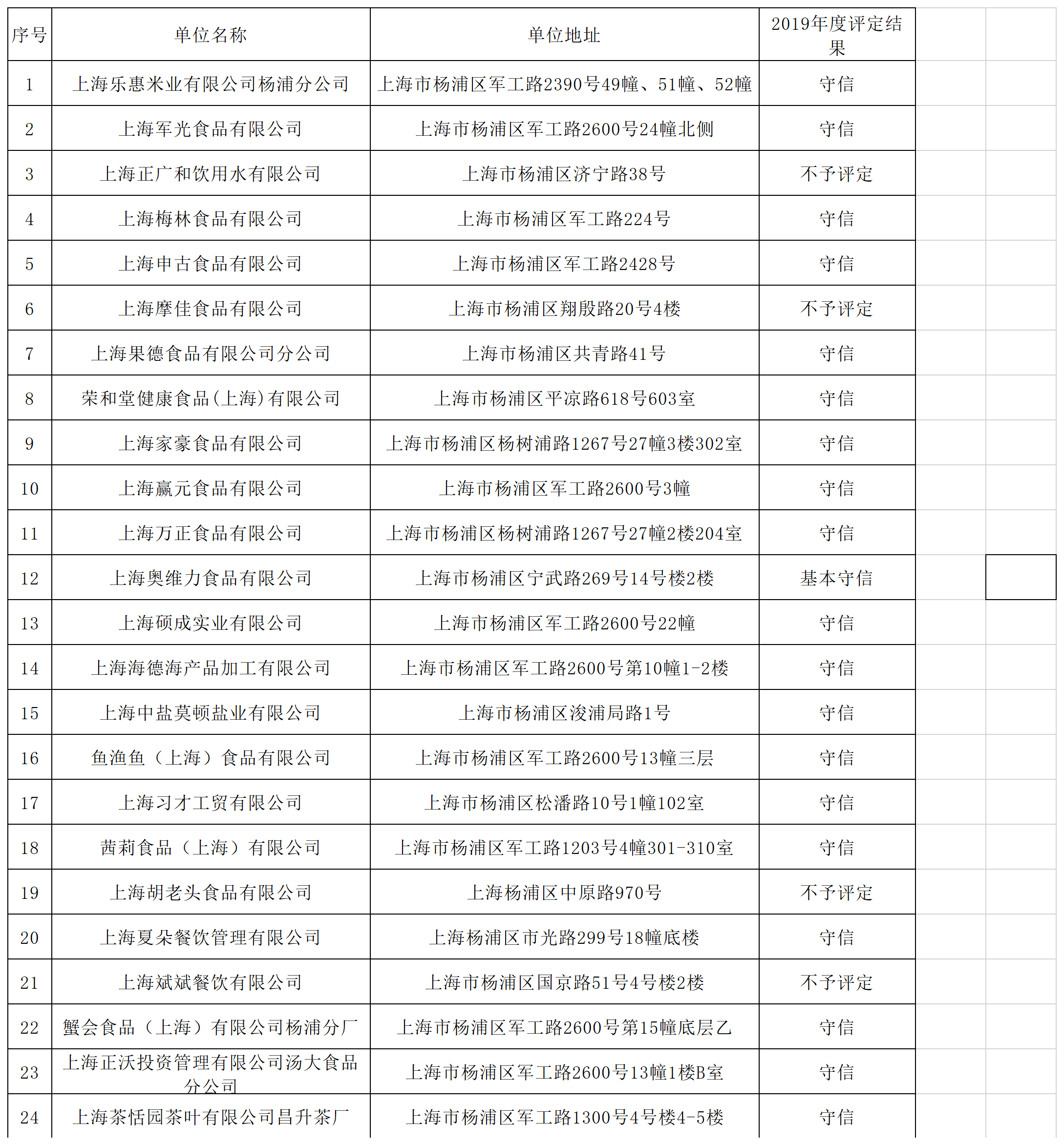 關于2019年楊浦區食品生產企業食品安全信用等級結果的公示